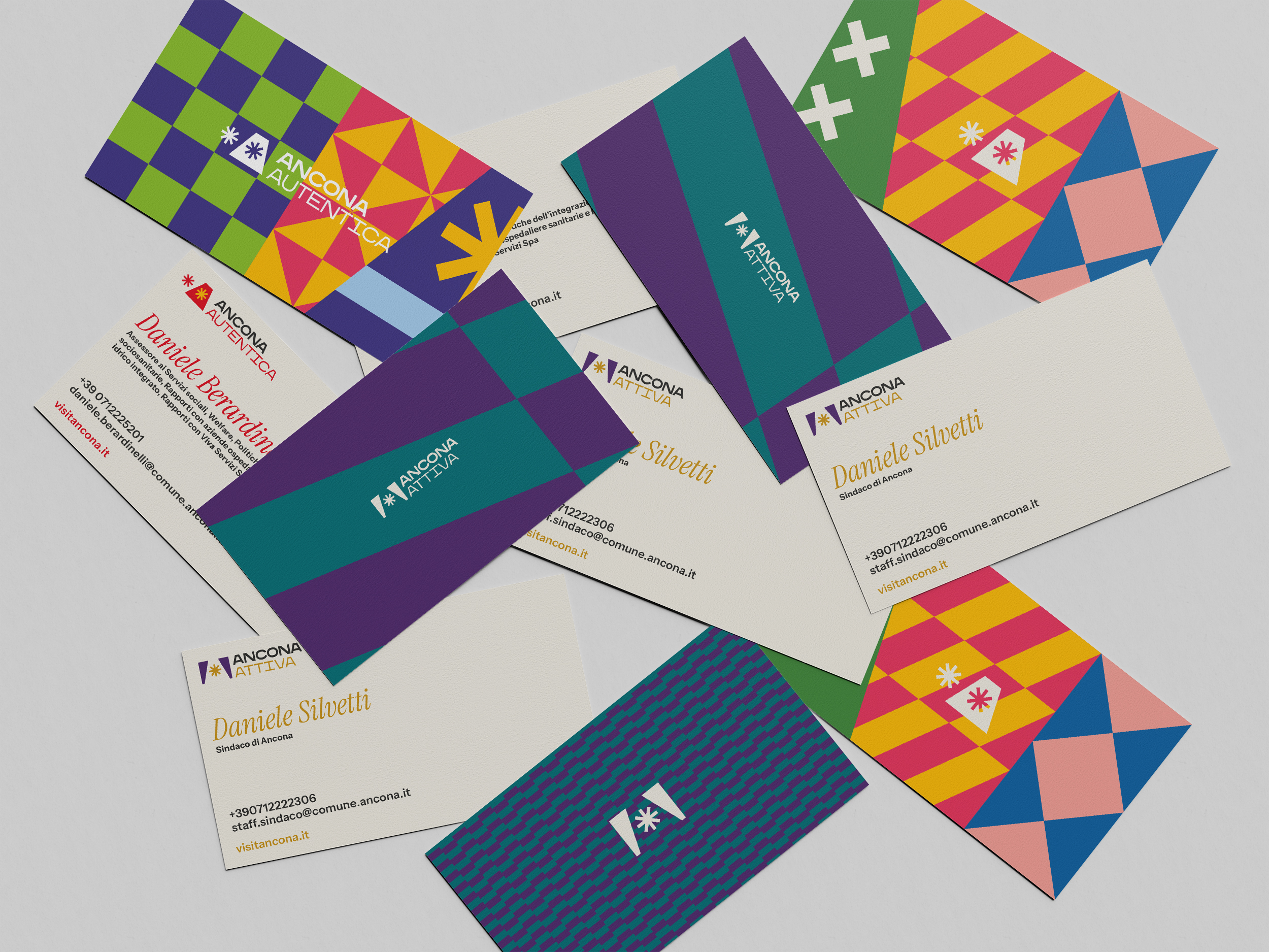 Institutional applications are developed across the two channels: Ancona Autentica is colorful and bold, alternating patterns and festoons with the A and a grammar of symbols derived from the Passetto doors. Ancona Attiva is more elegant, with dark, digital tones contrasted with gold, alternating macro patterns with micro textures.