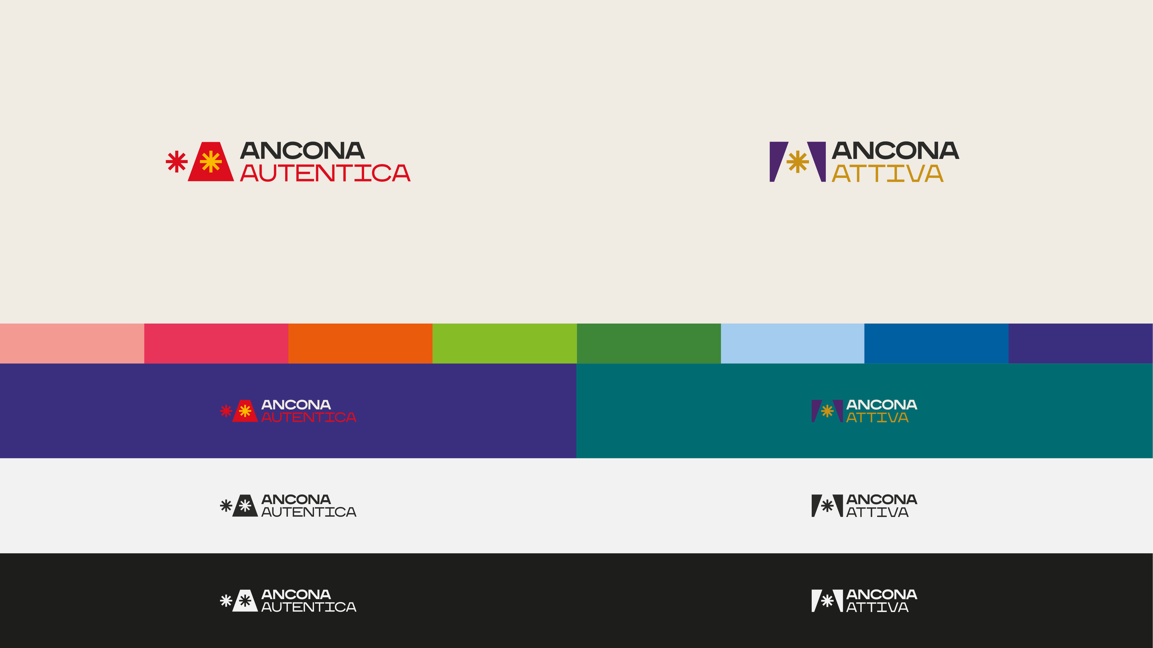 Color is a key element of Ancona’s identity. The palette is rooted in the city’s history, landscape and economy. Red and yellow define Ancona Autentica, supported by tones drawn from the territory. Purple and teal, contrasted with gold, characterize Ancona Attiva and its business focus. In monochrome applications, black and white shift to 7% and 97% black to maintain depth.